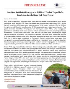 - Presiden Republik Indonesia untuk segera mengambil langkah tegas dalam meninjau ulang proses redistribusi tanah di Kabupaten Blitar dan memastikan tanah tersebut jatuh ke tangan para petani yang berhak.